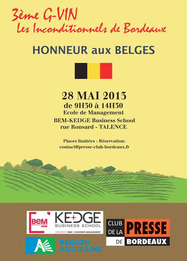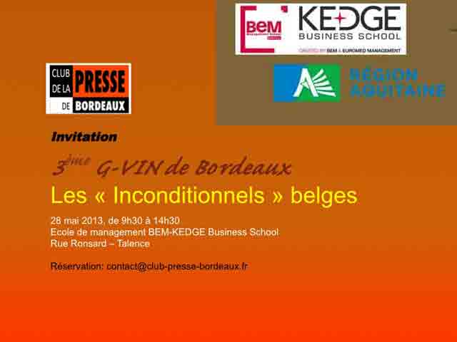 Le club de la presse de Bordeaux présente le G-Vin par cpbxone   3ème G-VIN Honneur aux Belges : les inconditionnels de Bordeaux    Mardi 28 mai 2013 – 9h30 à BEM-KEDGE Business School   La Belgique, un investisseur dans le bordelais historique et méconnu Le journaliste Barthélèmy, avec l’appui du Club de la Presse de Bordeaux, lire la suite