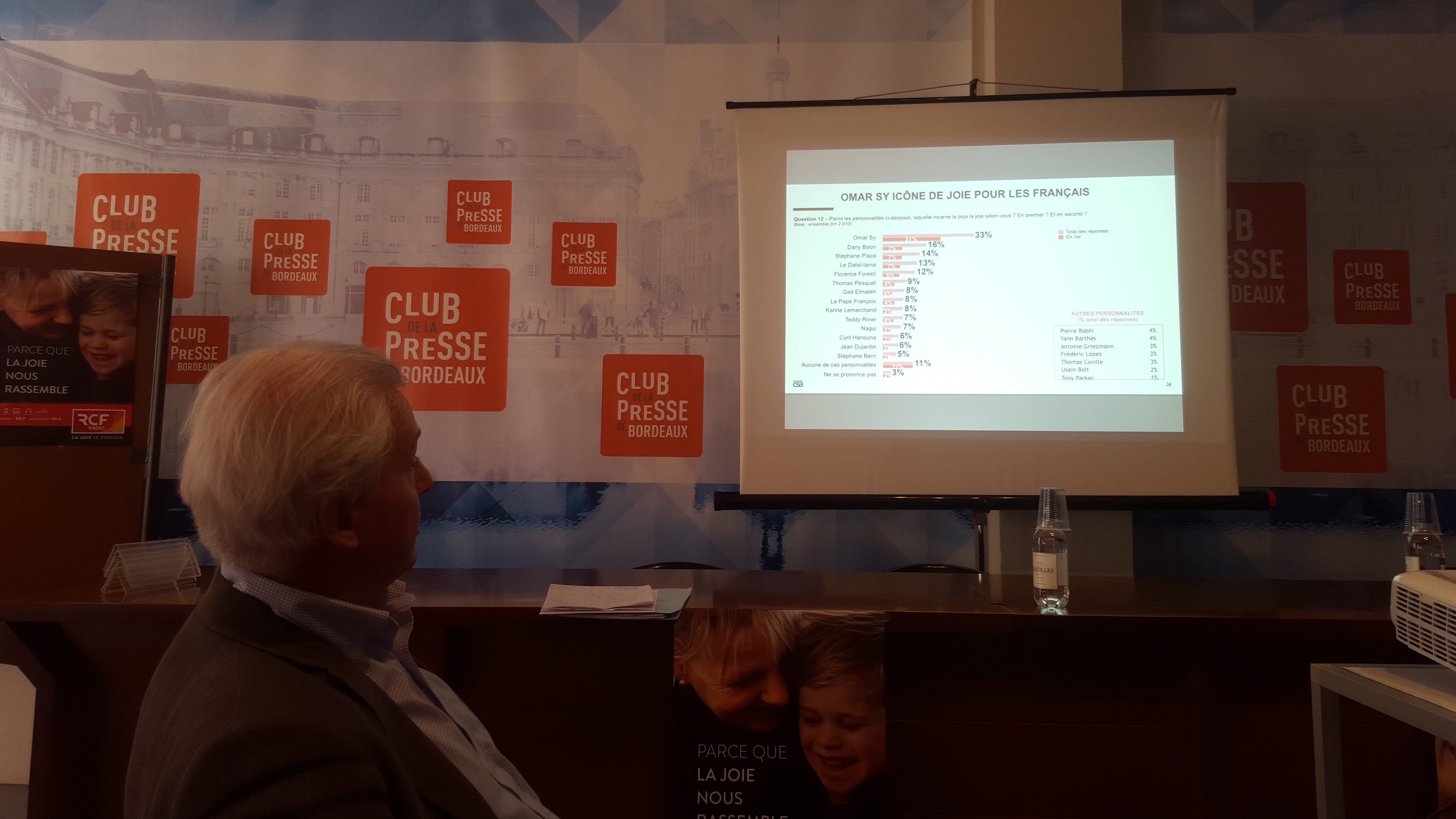 « Ce baromètre, c’est la deuxième fois que nous le réalisons, auprès de 2000 personnes, par CSA sur internet et par la méthode des quotas. ». Bernard d’Echallens, le président de la Radio Chrétienne Francophone (RCF) à Bordeaux, était venu au Club avec son chef d’antenne pour présenter un sondage plutôt original par les temps qui courent. « Cette année, reconnaît-il, le thème de la joie est un peu mis à l’épreuve, dans le contexte actuel et avec les élections. Mais il est riche d’enseignements, et il est probable qu’il existe une corrélation entre la joie et le monde qui nous entoure. Je pense que malgré toutes les incertitudes, le Français puise en son for intérieur une source de joie. »