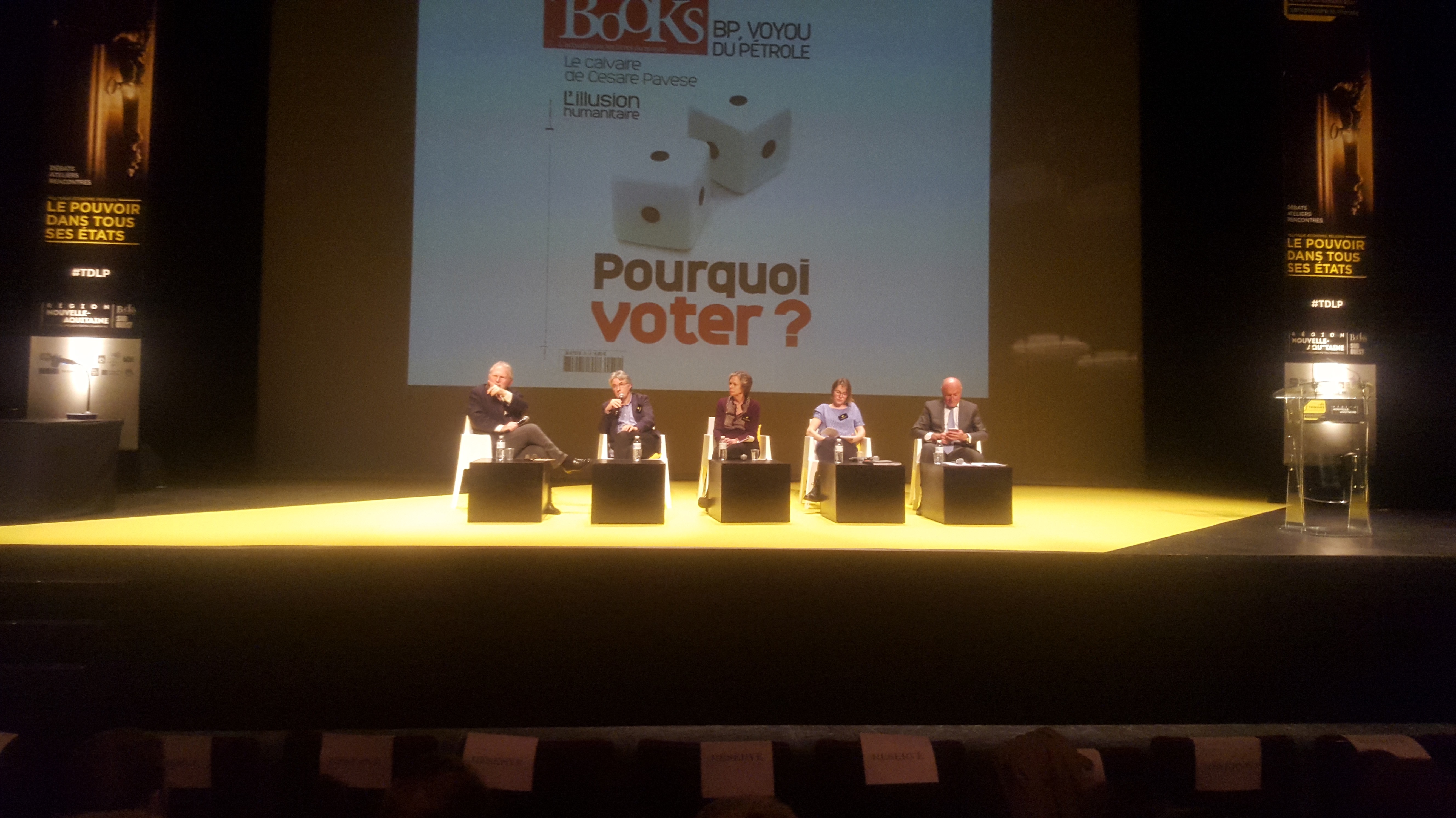 « La démocratie bégaïe », « les partis se déchirent », on relève une forte « crise de la représentativité » : Bernard Guetta en fait le triste constat. Sur la tribune, Célectine Bohlen, éminente journaliste du NewYork Times, pointe les différences entre la France et les Etats-Unis mais parle dans les cas d’« une démocratie vivante ». Louise Moulin, une des actrices des Nuits Debout, parle de « moment d’humanité », d’une « belle expérience ». Alain Rousset exprime son « sentiment de colère » mais nuance les résultats du quinquennat et avance les réussites régionales. Il insiste sur « les petits pas ». Gil Delannoi, politologue au CEVIPOF, entre dans les propositions avec une chambre consultative dont les membres seraient tirés au sort et un Sénat intégrant une part d’« élites autres que politiques » également tirées au sort. La méfiance dans les médias ressort une fois de plus mais les fausses nouvelles diffusées dans les réseaux sociaux sont autrement dangereuses, comme cela a été relevé à plusieurs reprises.