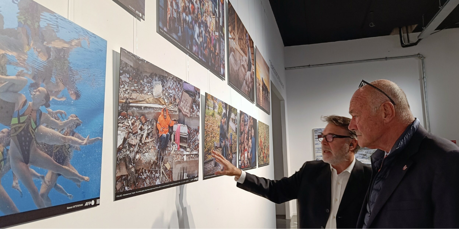 Pierre Fernandez, responsable de la promotion des contenus à la direction de l’information de l’AFP, a accueilli pour l’inauguration, Alain Rousset, le président du Conseil régional de Nouvelle-Aquitaine et toute l’équipe de la région organisatrice des Tribunes de la Presse.