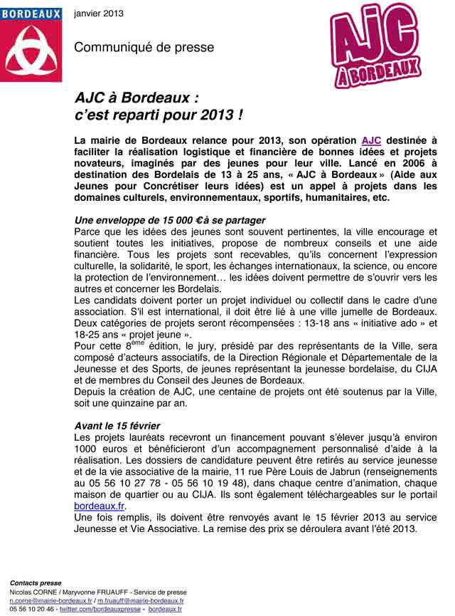 La mairie de Bordeaux relance pour 2013, son opération AJC destinée à faciliter la réalisation logistique et financière de bonnes idées et projets novateurs, imaginés par des jeunes pour leur ville.