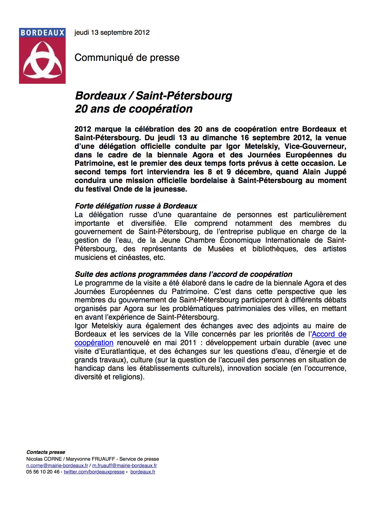 Bordeaux/ Saint-Pétersbourg, 20 ans de coopération.