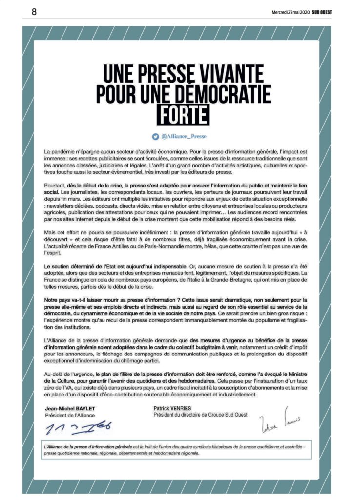 « Une presse vivante pour une démocratie forte » : l’Alliance de la Presse d’Information Générale, présidée par Jean-Michel Baylet, lance sous ce titre, ce matin, un appel co-signé pour Sud Ouest par Patrick Venries, président du directoire du Groupe. Objectif : obtenir un appui de l’Etat, suite aux conséquences du virus Covid-19 sur les médias écrits.