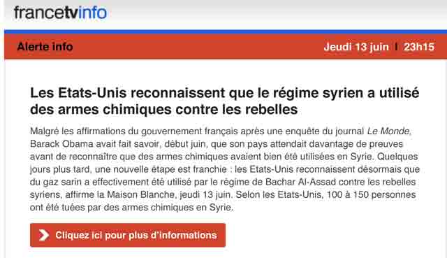 Sur place depuis des mois, il soupçonne l’usage d’armes chimiques dans le conflit syrien. Il traque les preuves, rencontre les témoins, dont un médecin au dévouement admirable. Il est pisté, suivi, enfin reconduit fermement à la frontière libanaise, la capsule de cyanure toujours en poche, en cas d’enlèvement.