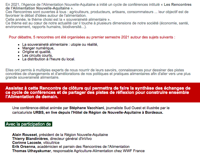 Accueil > Événements > Evénements à l'extérieur > Conférence AANA – SUD OUEST : « L’alimentation de demain en Nouvelle-Aquitaine » (21/10 à 10h30)