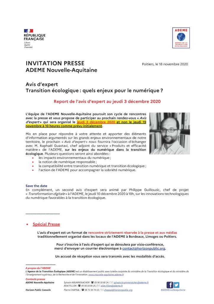 « Nous vous informons que l’avis d’expert prévu demain sur les enjeux environnementaux du numérique est reporté au jeudi 3 décembre à 10h00. Vous trouverez ci-joint l’invitation presse rectifiée, en précisant qu’un second avis d’expert, complémentaire, sera organisé le 10 décembre pour présenter l’apport du numérique à la transition écologique. »