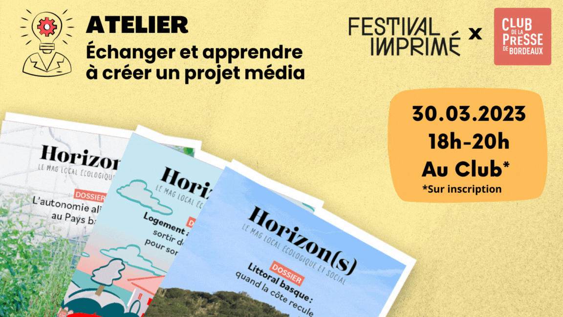 Dans le cadre du Festival Imprimé, le Club recevra : le studio Médianes, centre de ressources pour les médias, et Horizon(s), magazine axé sur les questions écologiques et sociales au Pays Basque. Ensemble, les deux entités proposent cet atelier pour échanger et apprendre à créer un projet média.