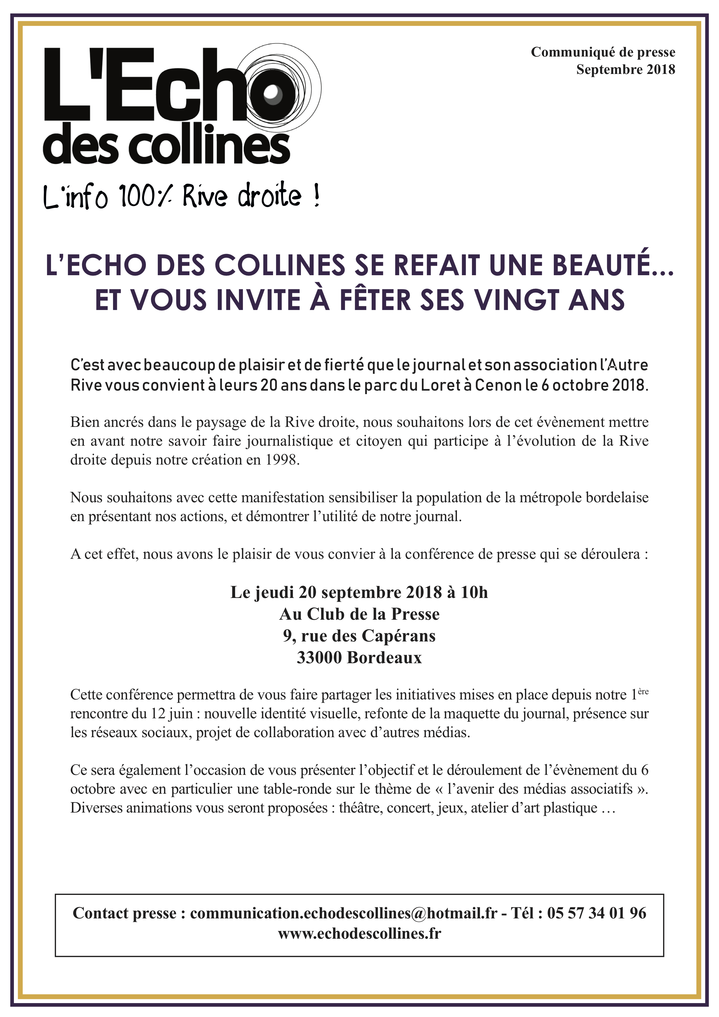 Accueil > Événements > Evénements au Club de la Presse > > L’Echo des Collines se refait une beauté et vous invite à fêter ses 20 ans – A 10h au Club