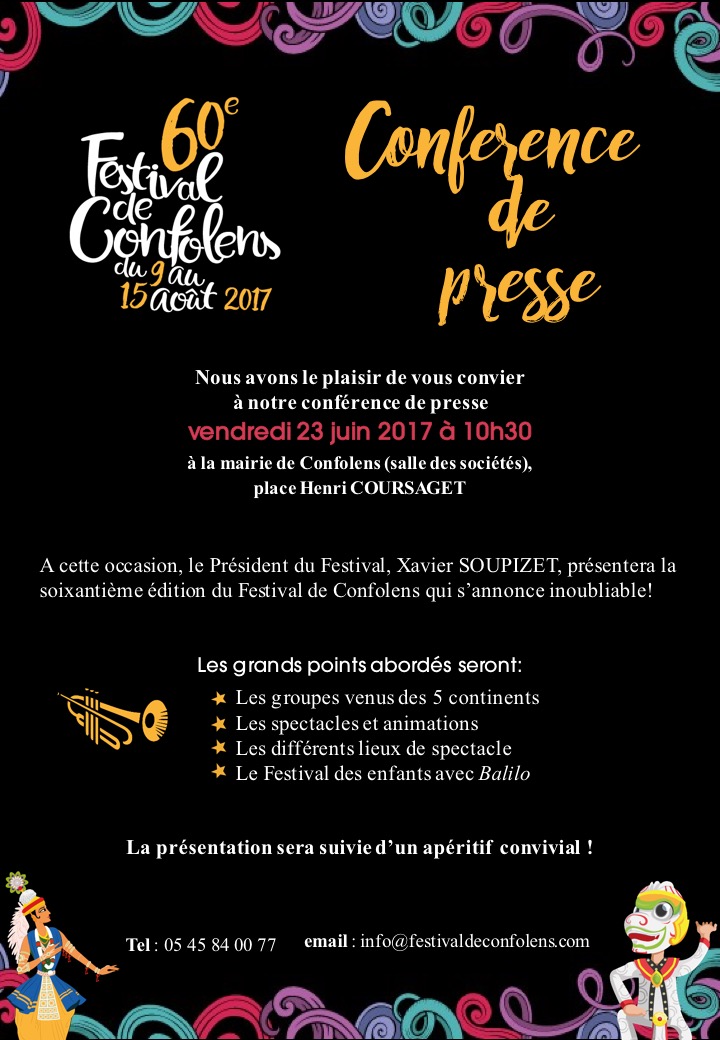 Je vous rappelle que la conférence de presse de la soixantième édition du festival de Confolens aura lieu ce vendredi 23 juin à 10h30 à la mairie de Confolens (salle des sociétés).