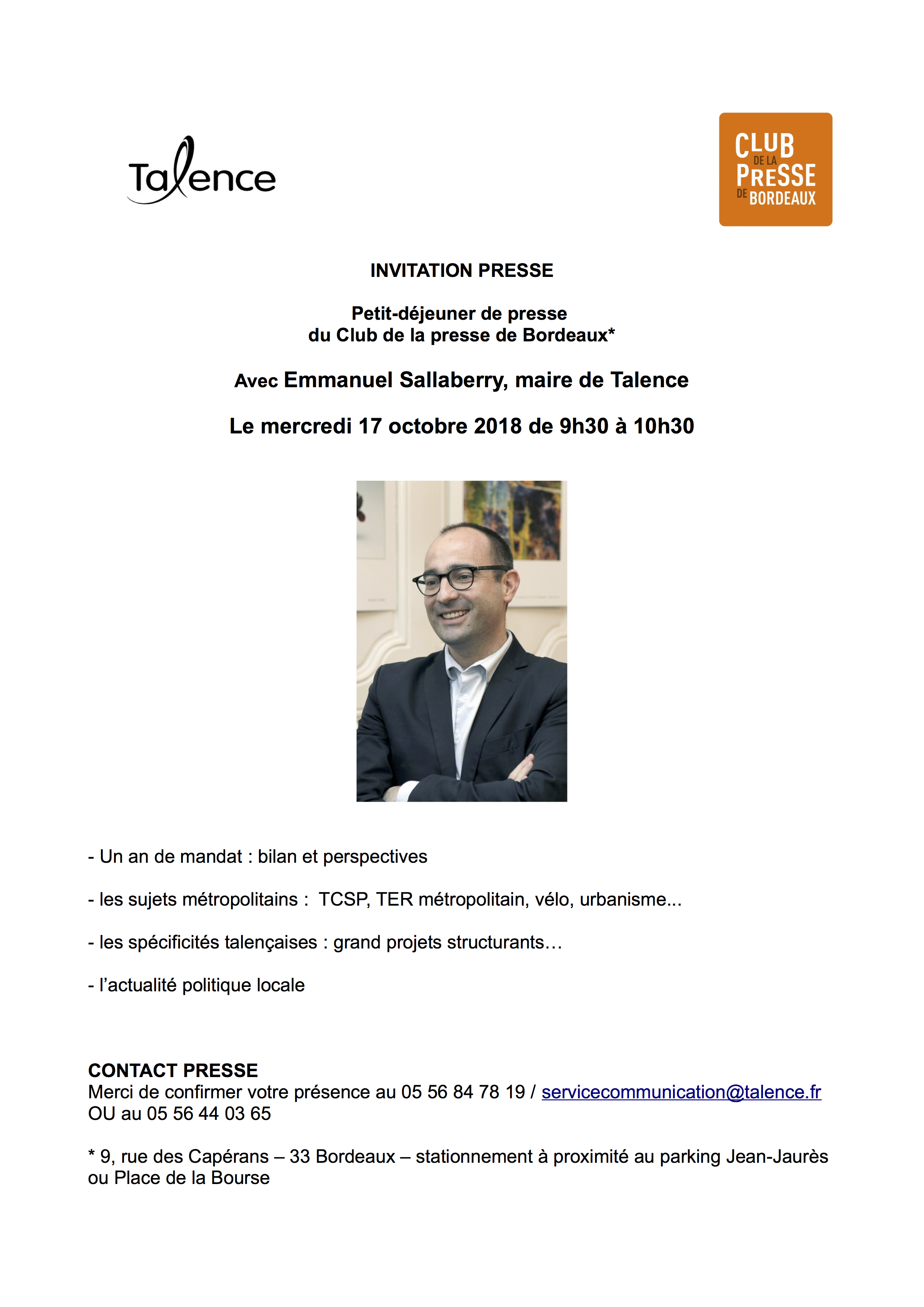 Accueil > Événements > Evénements au Club de la Presse > >Petit-déjeuner de presse avec Emmanuel Sallaberry, maire de Talence – A 9h30 au Club