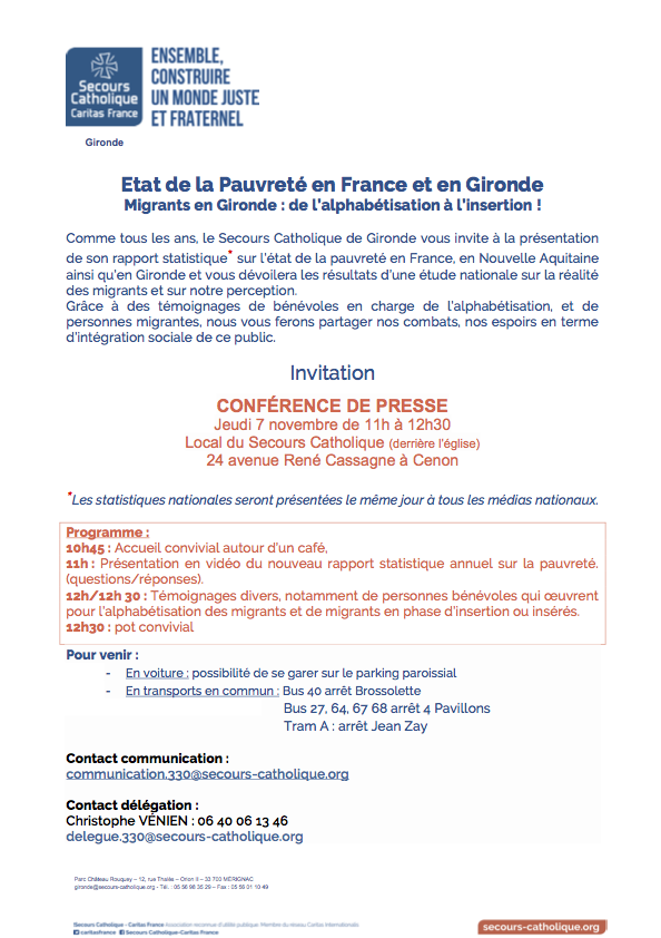 Le Secours Catholique est heureux de vous convier à sa conférence de presse annuelle qui aura pour thème cette année : Etat de la Pauvreté en France et en Gironde Migrants en Gironde : de l’alphabétisation à l’insertion ! Jeudi 7 novembre de 11h à 12h30 Local du Secours Catholique 24 avenue René Cassagne à lire la suite