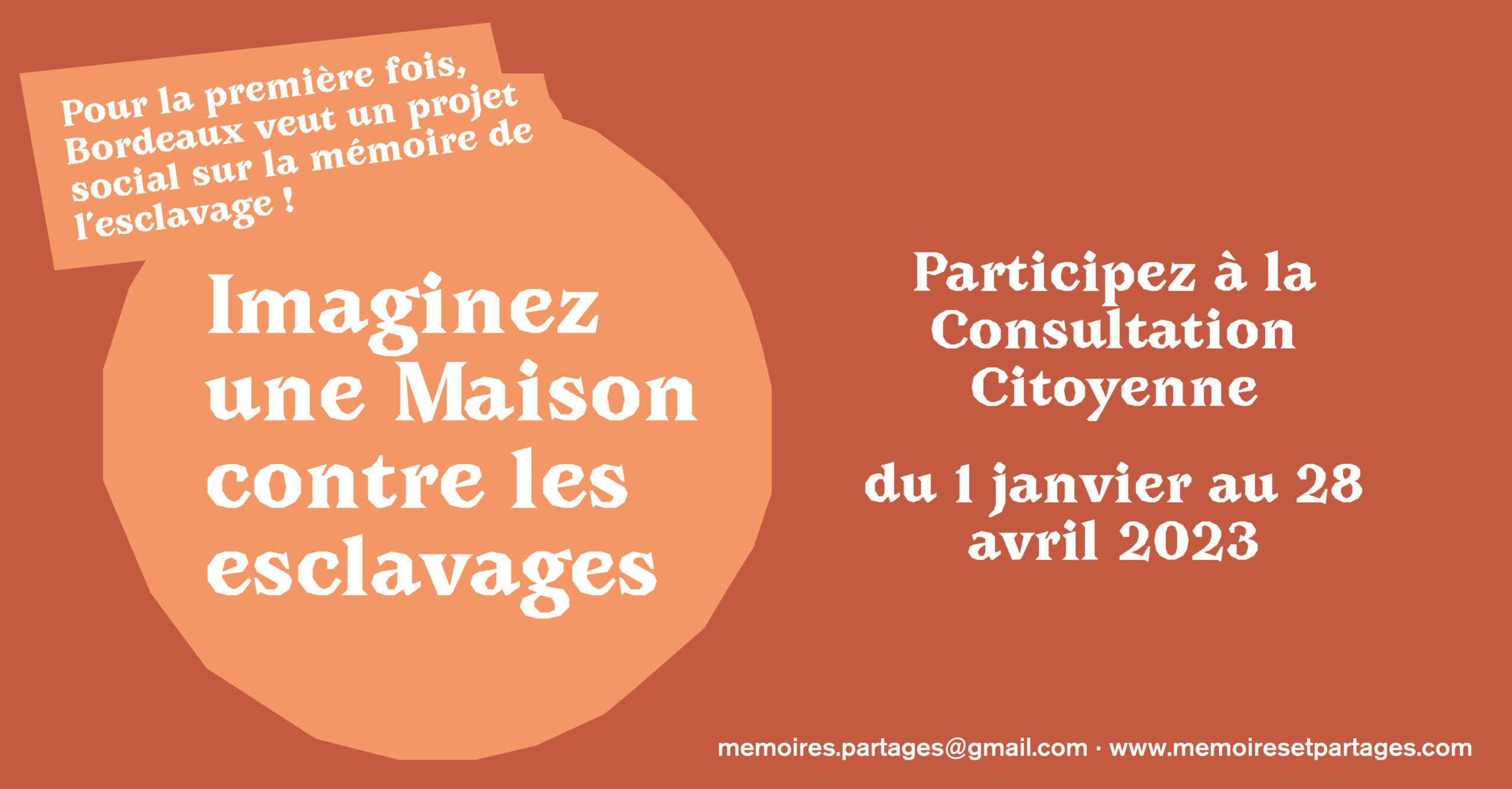 La question de la mémoire de l’esclavage est au cœur des sociétés de plusieurs continents (Europe, Afrique, Amérique). Elle permet à la fois une relecture plus équilibrée de l’histoire et le développement d’une société de respect, de tolérance et de l’acceptation de l’Autre. La Consultation Citoyenne a pour objet de recueillir l’avis des bordelais et de bordelaises afin de s’imprégner de leur opinion, leurs attentes et leurs propositions concernant le projet de Maison Contre les Esclavages.