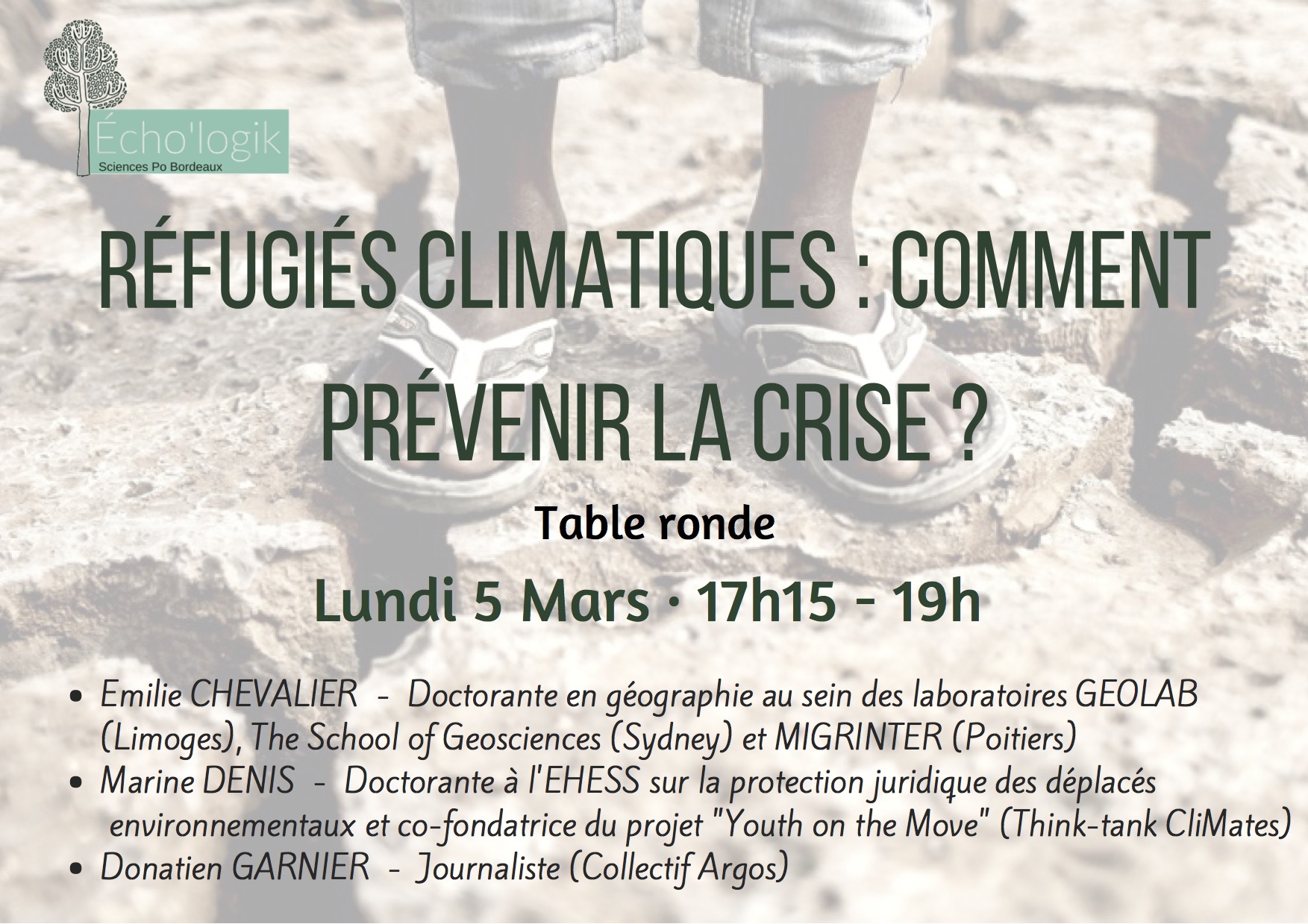L’association Echo’logik de SciencesPo Bordeaux, dédiée à la sensibilisation aux questions environnementales, organise le lundi 5 mars à 17h15 une conférence sur le thème des réfugiés climatiques: comment prévenir la crise ? Il s’agira d’une table ronde réunissant trois intervenants :