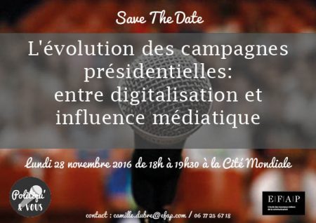 Les Présidentielles 2017 sont au cœur de toutes les discussions et la communication politique y joue un grand rôle. Conscients de cela, les étudiants de 4ème année de l’EFAP Bordeaux organisent le lundi 28 novembre prochain une conférence sur l’évolution des campagnes présidentielles: entre digitalisation et influence médiatique à La Cité Mondiale de 18h à 19h30.
