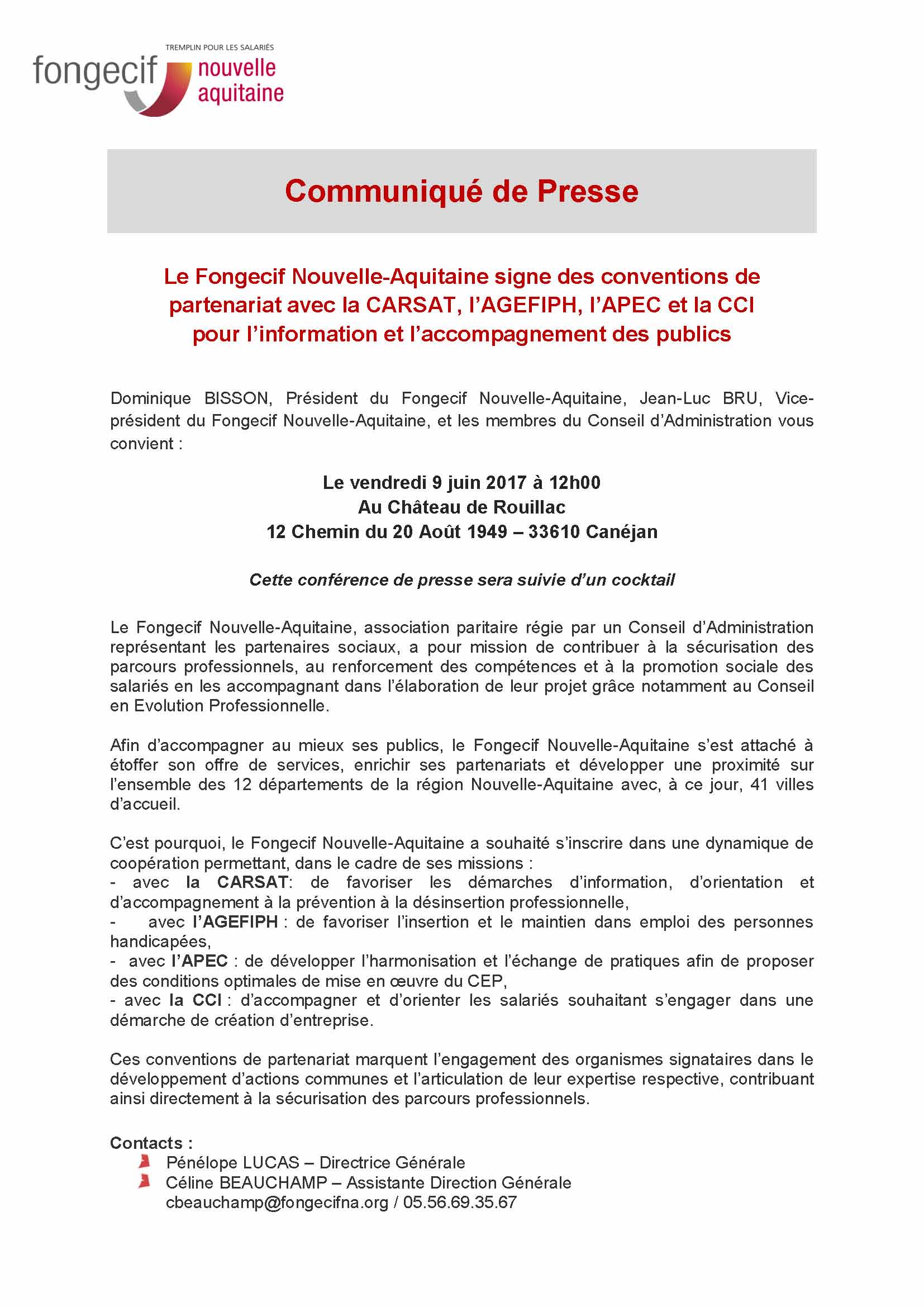Mesdames, Messieurs, Nous avons le plaisir de vous informer que le Fongecif Nouvelle-Aquitaine organise le 9 juin prochain au Château de Rouillac à Canejan, une conférence de presse. A ce titre, vous trouverez ci-joint le communiqué de presse. Nous vous remercions de bien vouloir nous confirmer votre présence avant le 22/05/2017. Restant lire la suite