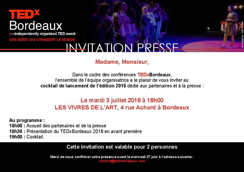 Accueil > Événements > Evénements à l'extérieur > > Invitation presse – Lancement de TEDxBordeaux2018