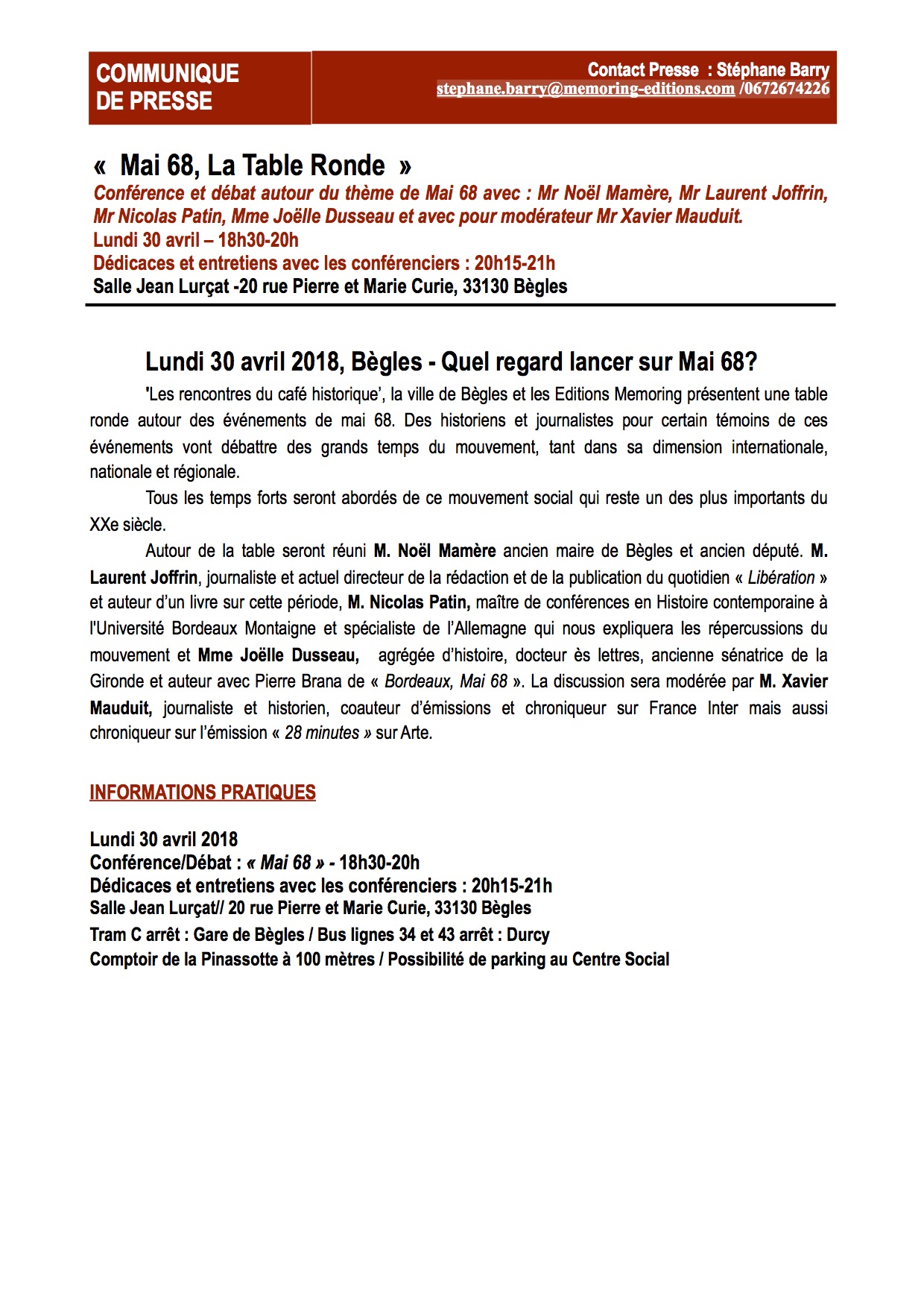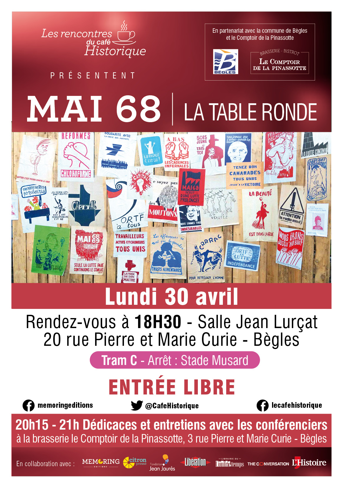 Accueil > Événements > Evénements à l'extérieur > Mai 68, la table ronde par Les rencontres du café Historique – 18 h 30 à Bègles