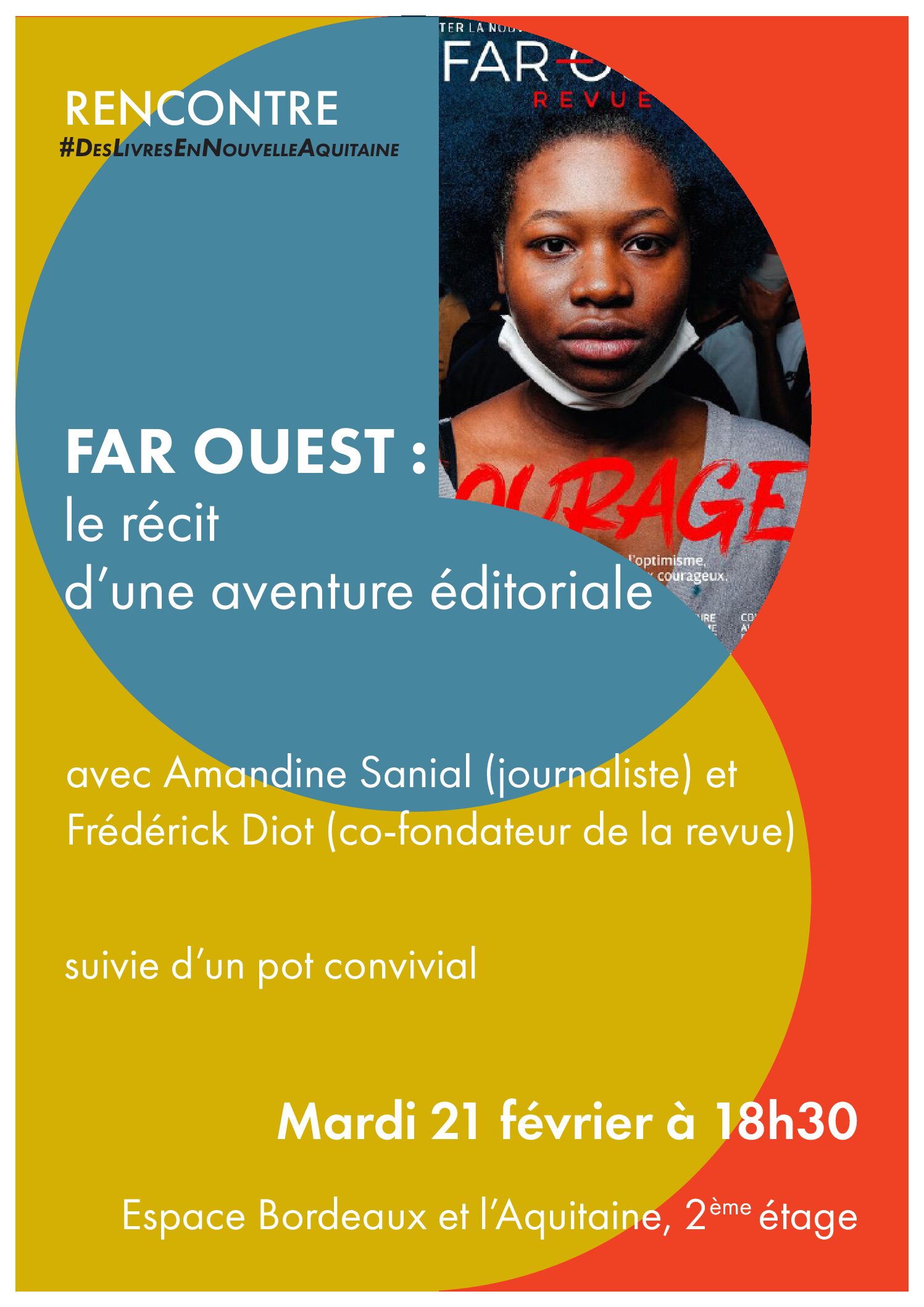 Mardi 21 février prochain à partir de 18h30, la bibliothèque de Meriadeck accueille Amandine Sanial (journaliste) et Frédérick Diot (co-fondateur de la revue) à l'occasion d'une discussion autour de la revue Far Ouest.