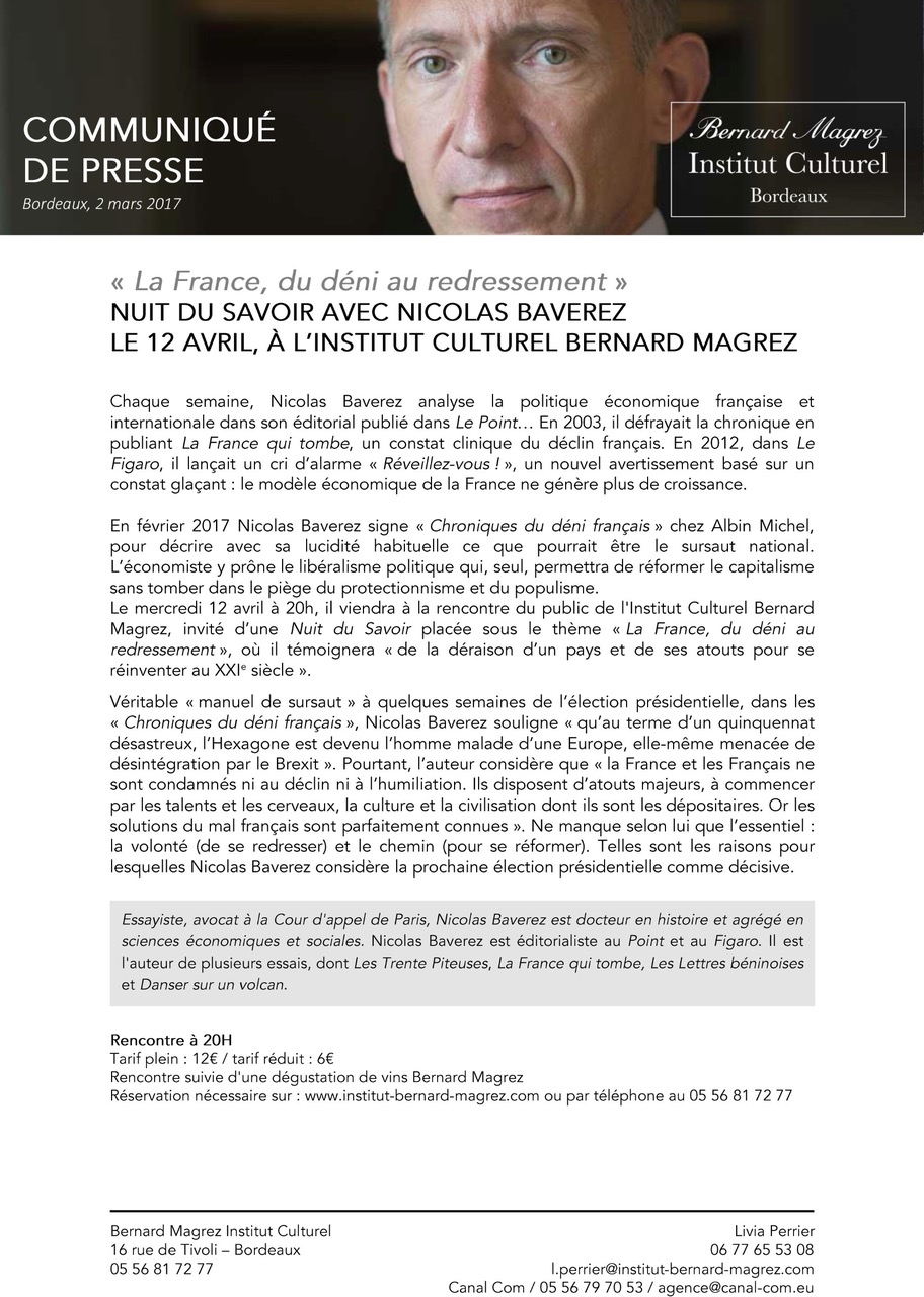 Venue de Nicolas Baverez à Bordeaux, rendez-vous présenté ci-dessous et dans le communiqué joint. L’éditorialiste au Point et au Figaro sera à l’Institut Culturel Bernard Magrez le 12 avril prochain, pour une conférence sur le thème « La France, du déni au redressement ». Le communiqué de presse intégral : cp_nicolas_baverez_a_l_icbm-v3