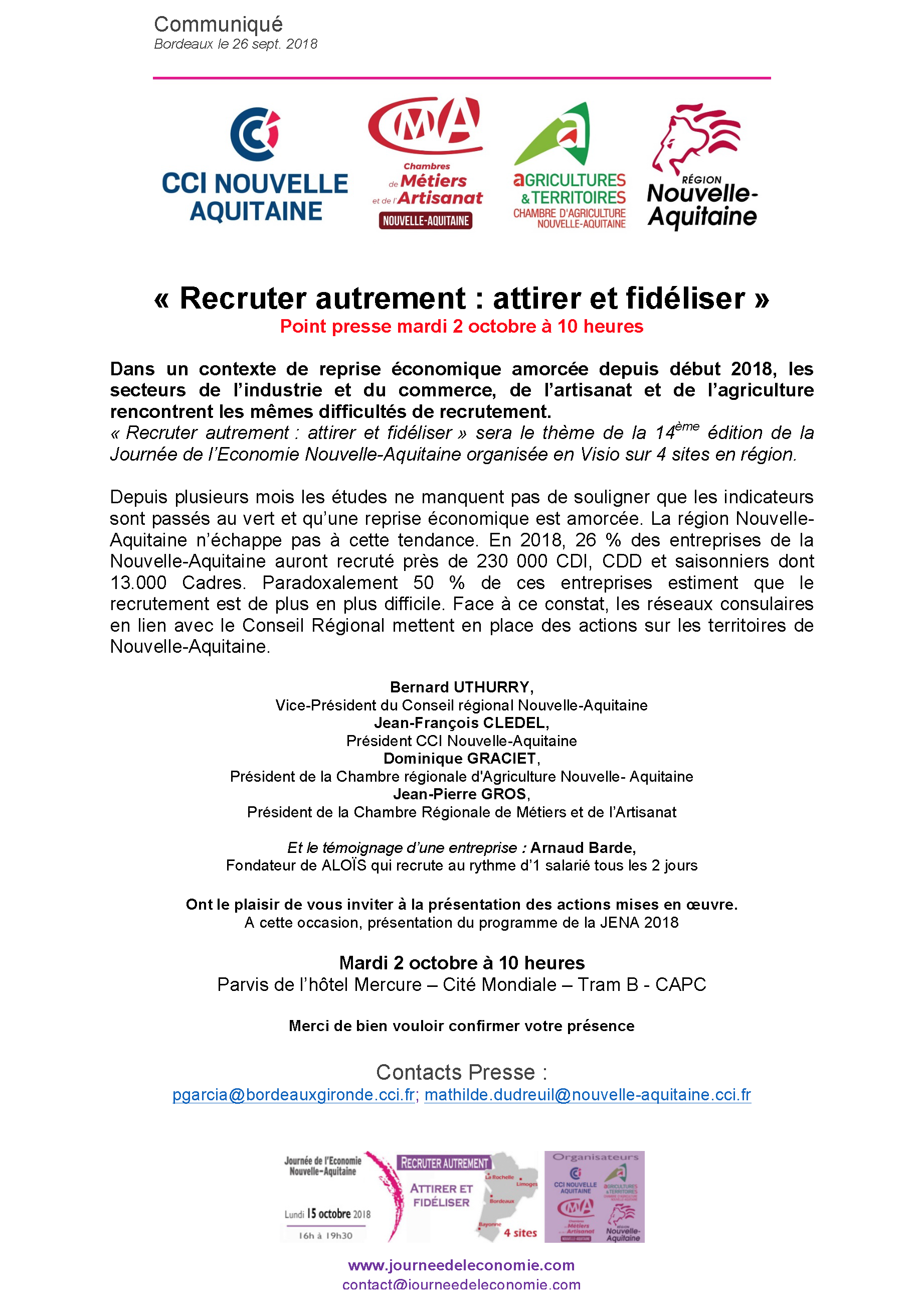 Accueil > Événements > Evénements à l'extérieur > > Point presse à 10h : « Recruter autrement : attirer et fidéliser » Journée de l’Économie Nouvelle-Aquitaine