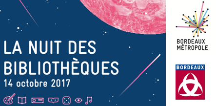 Samedi 14 octobre 2017, les bibliothèques de la métropole de Bordeaux proposent leur première « Nuit des bibliothèques ». Cet événement inédit associe 28 bibliothèques de 20 communes de la métropole dans un même esprit festif, convivial et participatif. Comme la Nuit Européenne des Musées, la Nuit des bibliothèques permettra gratuitement à tous de découvrir ces sites de culture, leurs activités, leurs services et leurs collections jusqu’à 22h ou minuit, sous une forme différente. Au programme : jeux, concerts, expositions, lectures, dj set, apéro quizz, etc.