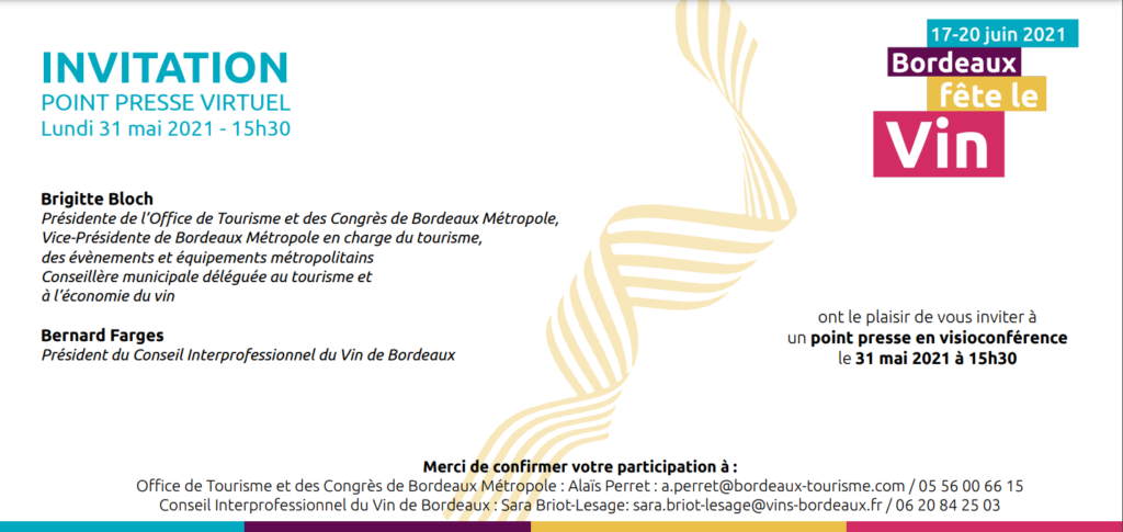 Lien pour participer au point presse du lundi 31 mai 15h30. Contact presse : Office de tourisme et des congrès de Bordeaux métropole : Alaïs PERRET : a.perret@bordeaux-tourisme.com – 05 56 00 66 15
