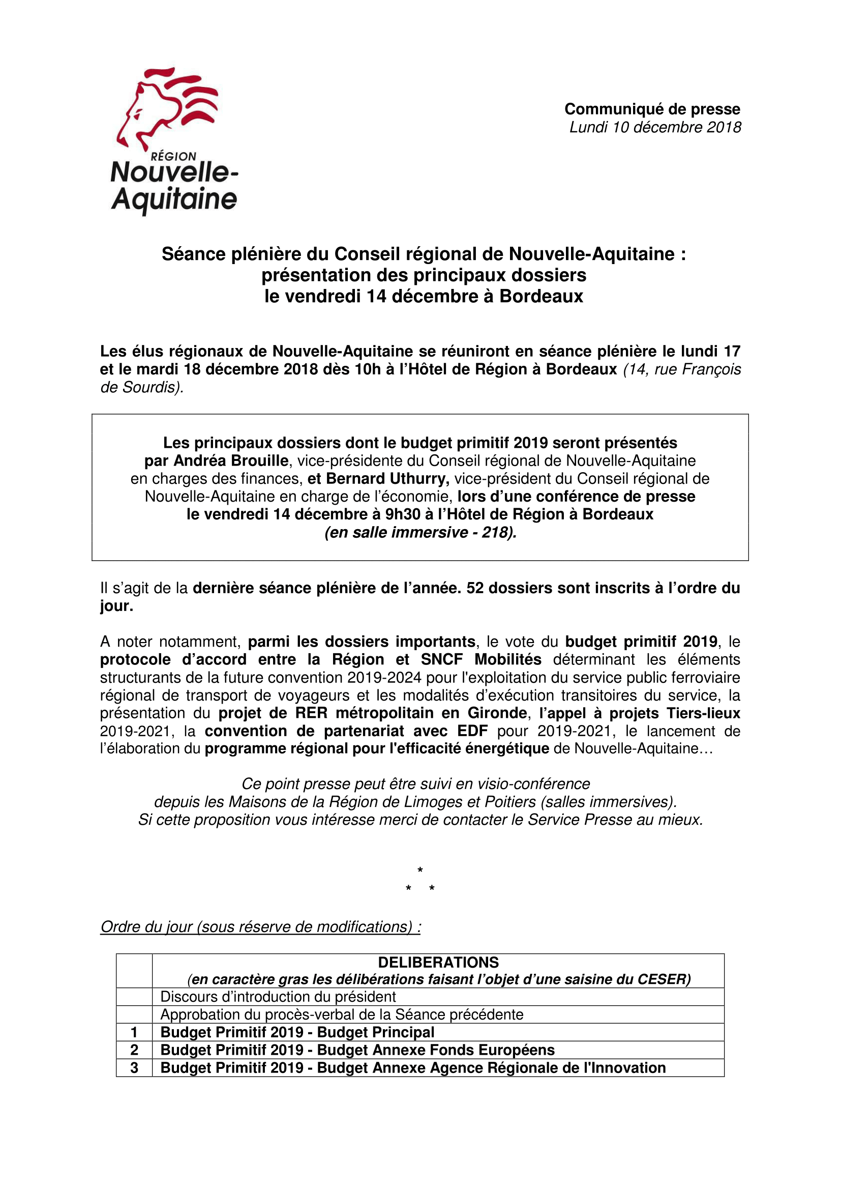 Accueil > Événements > Evénements à l'extérieur > >Presse: Séance plénière du Conseil régional de Nouvelle-Aquitaine, à 9h30