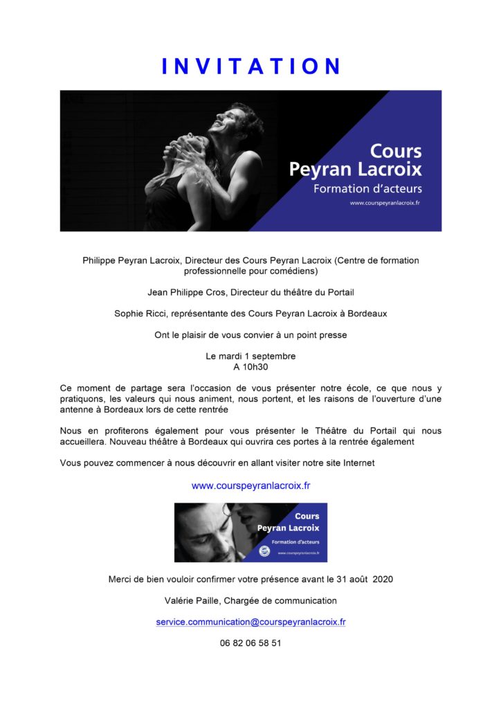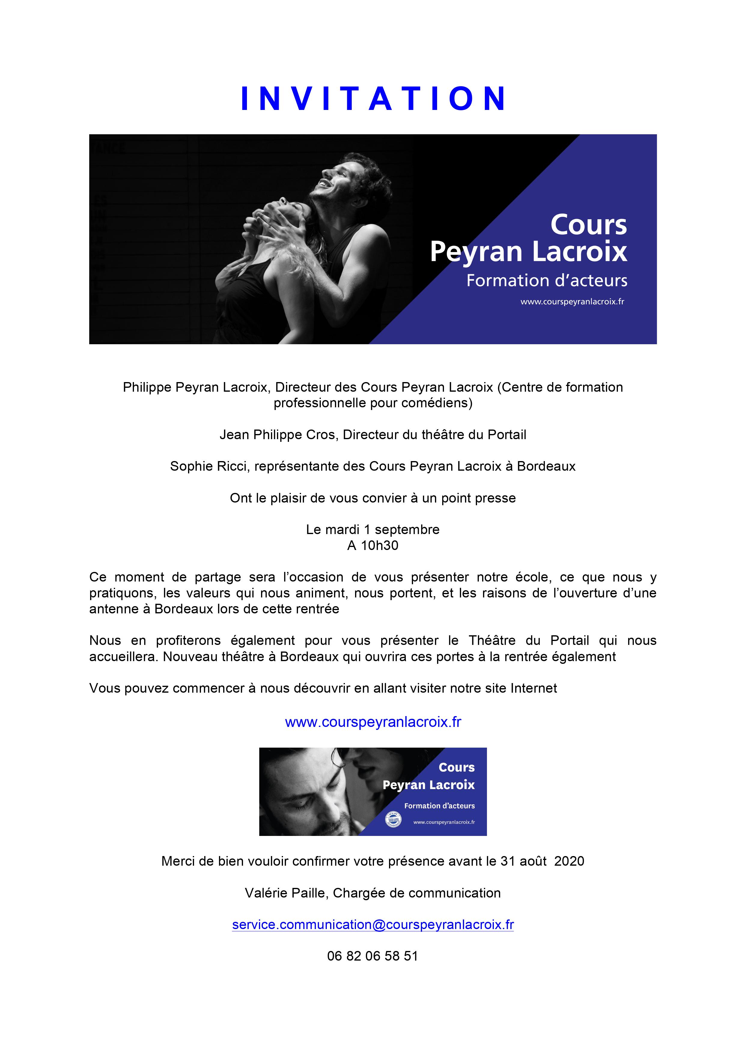 Le Club de la presse de Bordeaux Nouvelle-Aquitaine accueille la visio-conférence de presse « Les Cours Peyran Lacroix (Centre de formation professionnelle pour comédiens) ouvrent une antenne à Bordeaux à la rentrée«  avec Philippe Peyran Lacroix, Directeur des Cours Peyran Lacroix Jean Philippe Cros, Directeur du théâtre du Portail Sophie Ricci, représentante des Cours Peyran Lacroix à Bordeaux lire la suite
