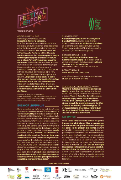 VISITE PRESSE : MERCREDI 18 AOÛT De 17h à 19h Contacts presse : Festival Perform – Direction artistique : sarah.trouche[at]gmail.com