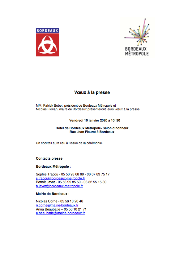 Vœux à la presse M. Patrick Bobet, président de Bordeaux Métropole et Nicolas Florian, maire de Bordeaux présenteront leurs vœux à la presse : Vendredi 10 janvier 2020 à 10h30 Hôtel de Bordeaux Métropole- Salon d’honneur Rue Jean Fleuret à Bordeaux Un cocktail aura lieu à l’issue de la cérémonie.