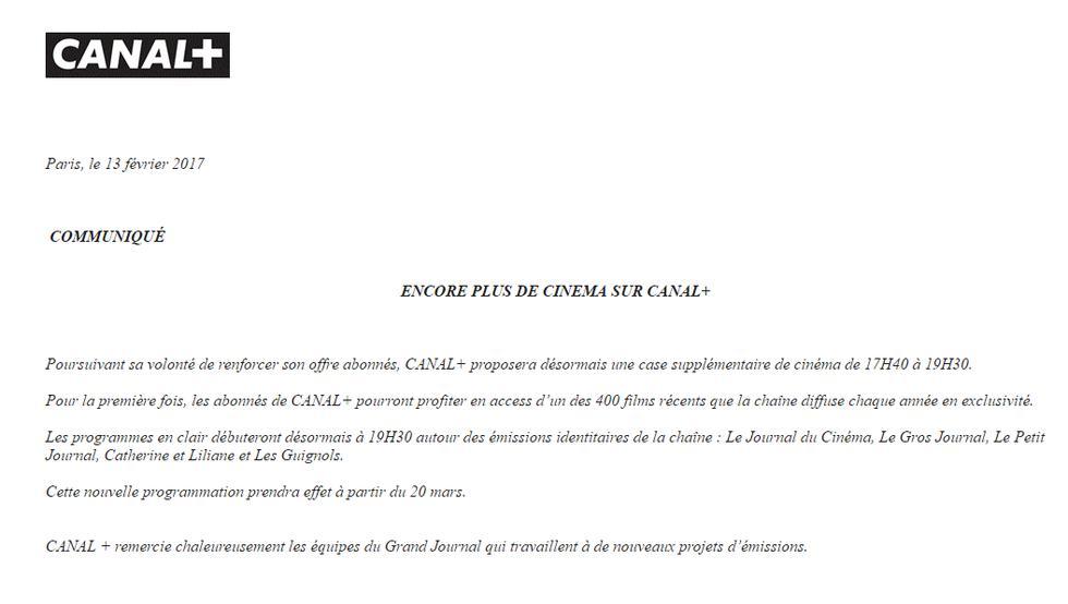 C’est par un communiqué laconique indiquant non pas la fin de l’émission mais le renforcement du cinéma sur la chaîne que Canal + a signé l’arrêt de mort de ce moment emblématique de son antenne. L’émission s’arrêtera le 3 mars et des best-off seront diffusés les deux semaines suivantes. Le communiqué de Canal + de lire la suite