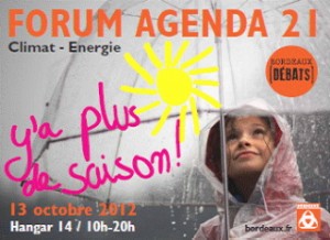 Samedi 13 octobre 2012 de 10h à 20h au Hangar 14, la mairie de Bordeaux propose une nouvelle édition de son Forum Agenda 21 (ouvert à tous, entrée libre). Cette année, la manifestation s’empare des questions liées au climat et à l’énergie, avec un esprit ludique, responsable et la participation exceptionnelle de Yann Arthus Bertrand, Joël de Rosnay et du climatologue Jean Jouzel. L’occasion de s’interroger sur l’engagement de chacun, grands et petits, chez soi ou au travail, pour contribuer à maintenir des bonnes conditions de vie sur la planète.