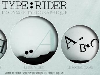 Type:Rider est le premier jeu vidéo co-produit par le département des webproductions d’Arte. Il se compose d’une application disponible en version tablette, smartphone, PC et Mac (9 niveaux de jeu + un nouveau bonus), d’une version jouable en ligne gratuitement sur le site d’Arte (5 niveaux de jeu), ainsi que d’un jeu Facebook. Véritable univers transmédia, il se décline aussi en une installation interactive montrée pour la première fois lors de la Transmédia Immersive University 2012.