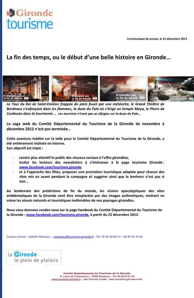 Accueil > Actualités > Actualité des médias > Communiqués > Gironde Tourisme communique