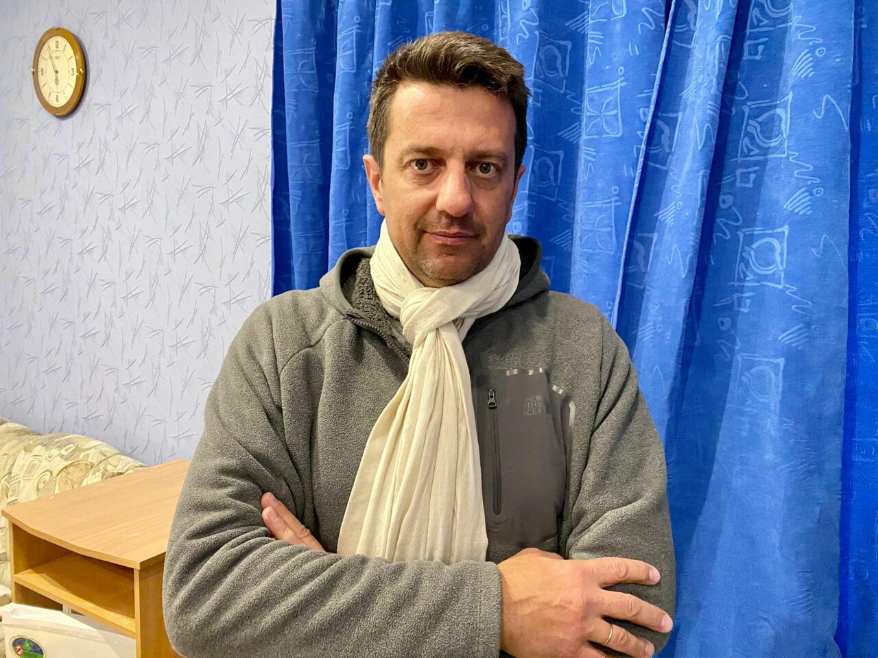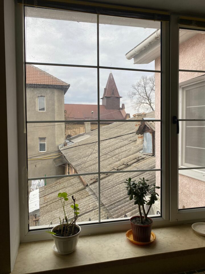 Le soir venu, après 19 heures (et le fameux couvre-feu) , avec ma consœur Stéphanie Rouquié, journaliste reporter pour Canal + et Cnews, nous faisons nos directs depuis une chambre de notre gîte, devant un grand rideau bleu. C’est notre « studio canal+ Ukraine » improvisé.