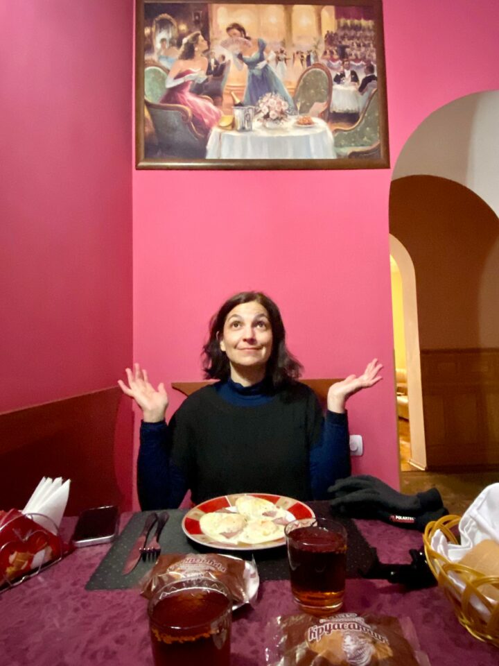 Au menu de notre repas, aujourd’hui, des œufs et des gâteaux industriels dans la salle du petit-déjeuner, sans fenêtres… La pièce est décorée de reproductions de toiles naïves de l’époque des Tsars…