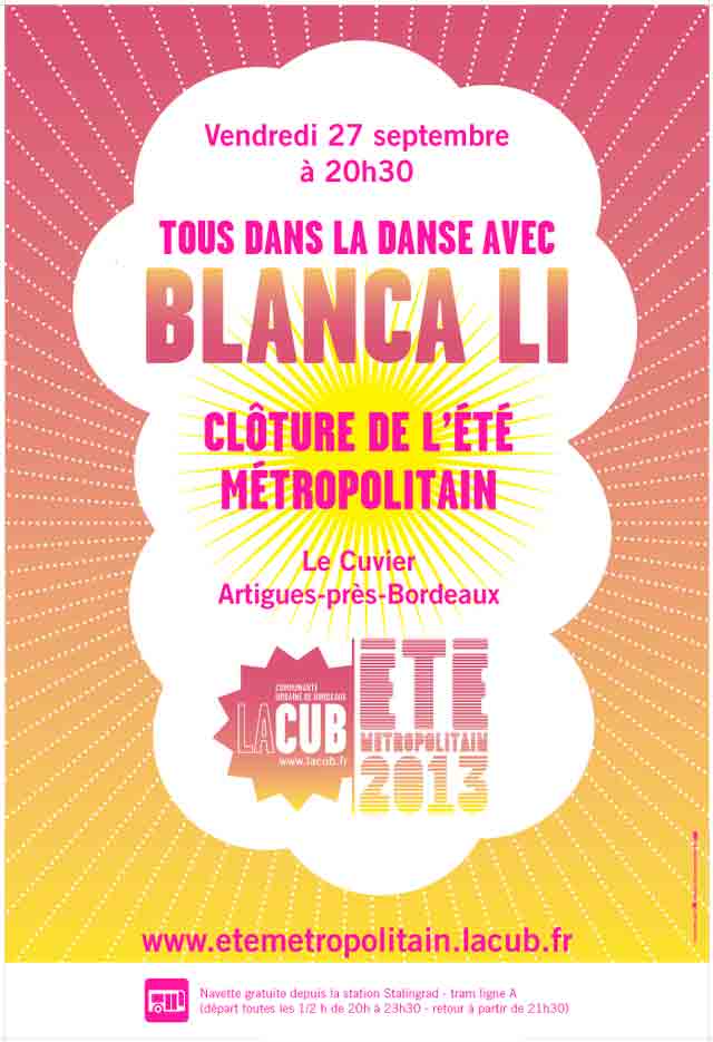Soirée de clôture de l’Eté métropolitain : « Tous dans la danse » est une manifestation orchestrée par la danseuse, chorégraphe, metteur en scène et réalisatrice Blanca Li. Cette soirée événement clôturera l’Eté métropolitain et sera l’occasion de célébrer simultanément la danse contemporaine et le nouveau Cuvier. « Tous dans la danse » http://etemetropolitain.lacub.fr/