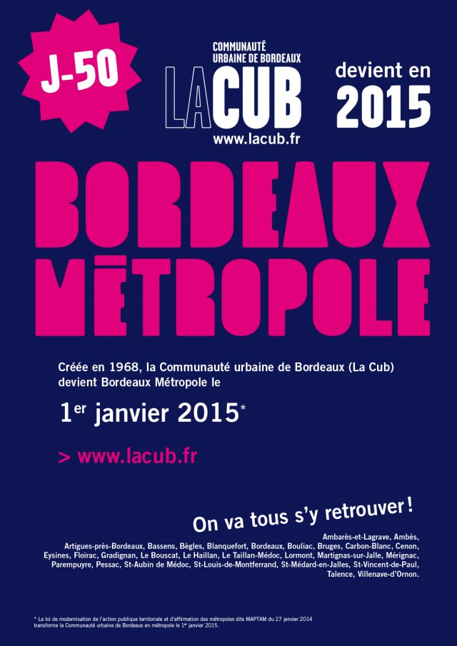 La Cub devient Bordeaux Métropole De nouvelles compétences, la mutualisation de moyens et de services avec les 28 communes… Créée en 1968, La Communauté urbaine de Bordeaux devient Bordeaux Métropole au 1er janvier 2015. Le compte à rebours a commencé ! http://www.lacub.fr/la-cub-devient-metropole