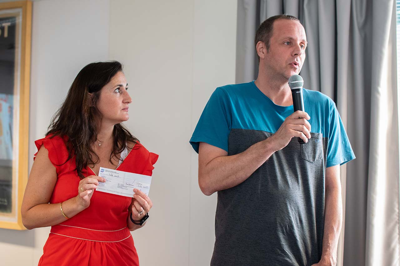 Aude Ferbos, Présidente du Club, a remis un chèque à Sylvain Clament, fondateur de RFPI, pour son action auprès des journalistes exilé·e·s.