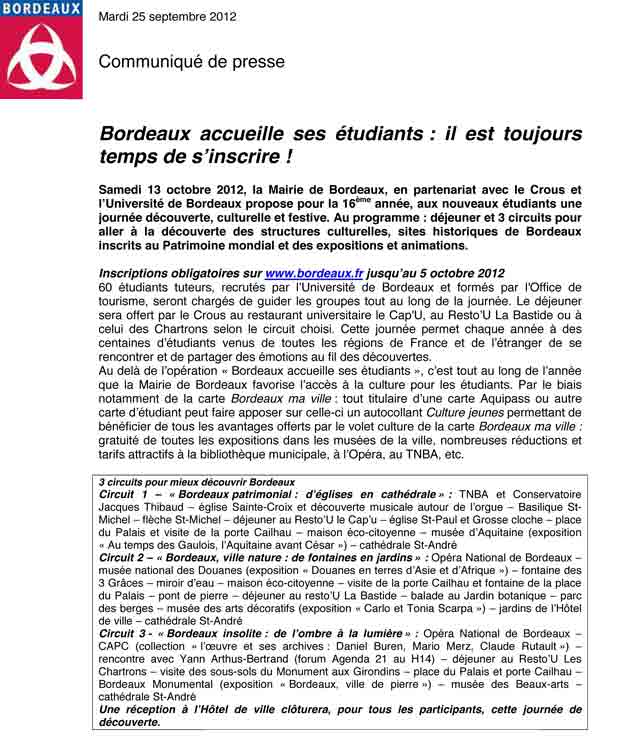 Bordeaux accueille ses étudiants : il est toujours temps de s’inscrire Contacts presse Nicolas CORNE / Maryvonne FRUAUFF-service de presse n.corne@mairie-bordeaux.fr / m.fruauff@mairie-bordeaux.fr Tel.05 56 10 20 48 www.bordeaux.fr