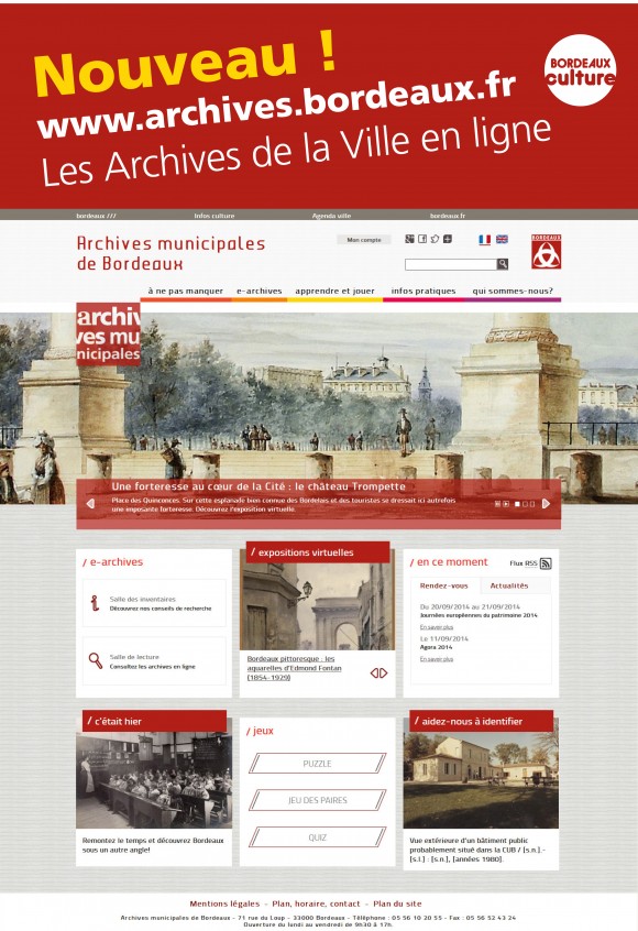 Depuis le Moyen Âge, les Archives municipales de Bordeaux collectent, conservent, classent et communiquent au public les fonds d’archives qui leur sont confiés tant par l’administration communale que par des particuliers, familles, entreprises ou associations ayant un lien avec la ville. Alors qu’elles s’apprêtent à déménager de la rive gauche à la rive droite dans l’ancienne Halle aux farines rénovée (ouverture début 2016) un nouveau site Internet va permettre de maintenir le lien avec le public pendant l’année 2015 période de fermeture.