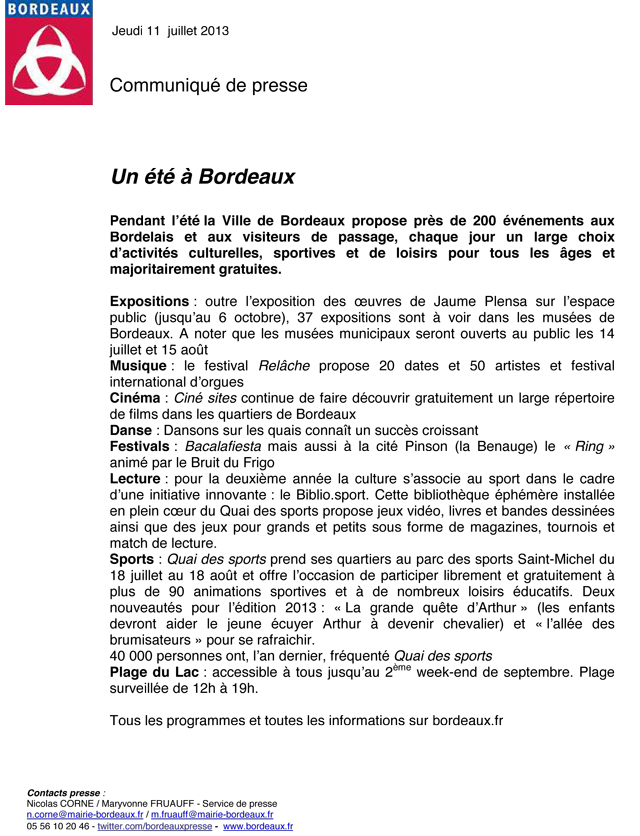 Tous les programmes et toutes les informations sur www.bordeaux.fr Contacts presse : Nicolas CORNE / Maryvonne FRUAUFF – Service de presse n.corne@mairie-bordeaux.fr / m.fruauff@mairie-bordeaux.fr 05 56 10 20 46 – twitter.com/bordeauxpresse – www.bordeaux.fr