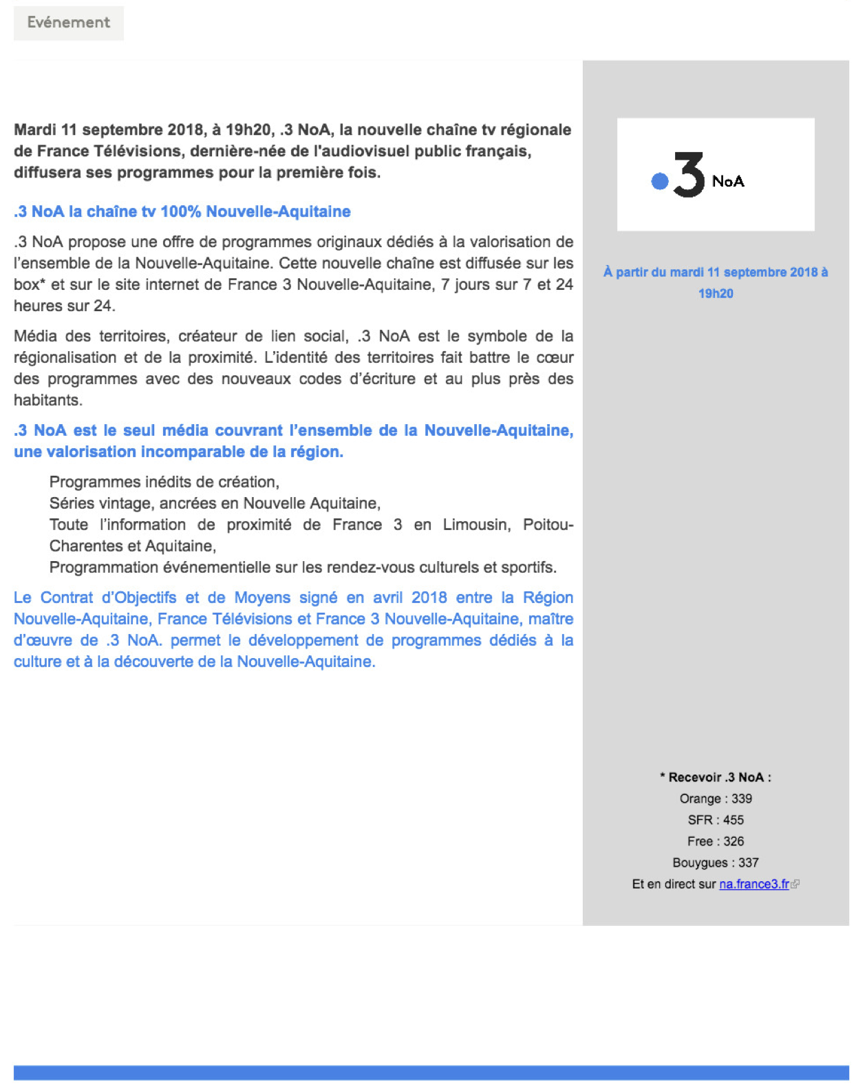 Mardi 11 septembre 2018, à 19h20, .3 NoA, la nouvelle chaîne tv régionale de France Télévisions, dernière-née de l’audiovisuel public français, diffusera ses programmes pour la première fois.