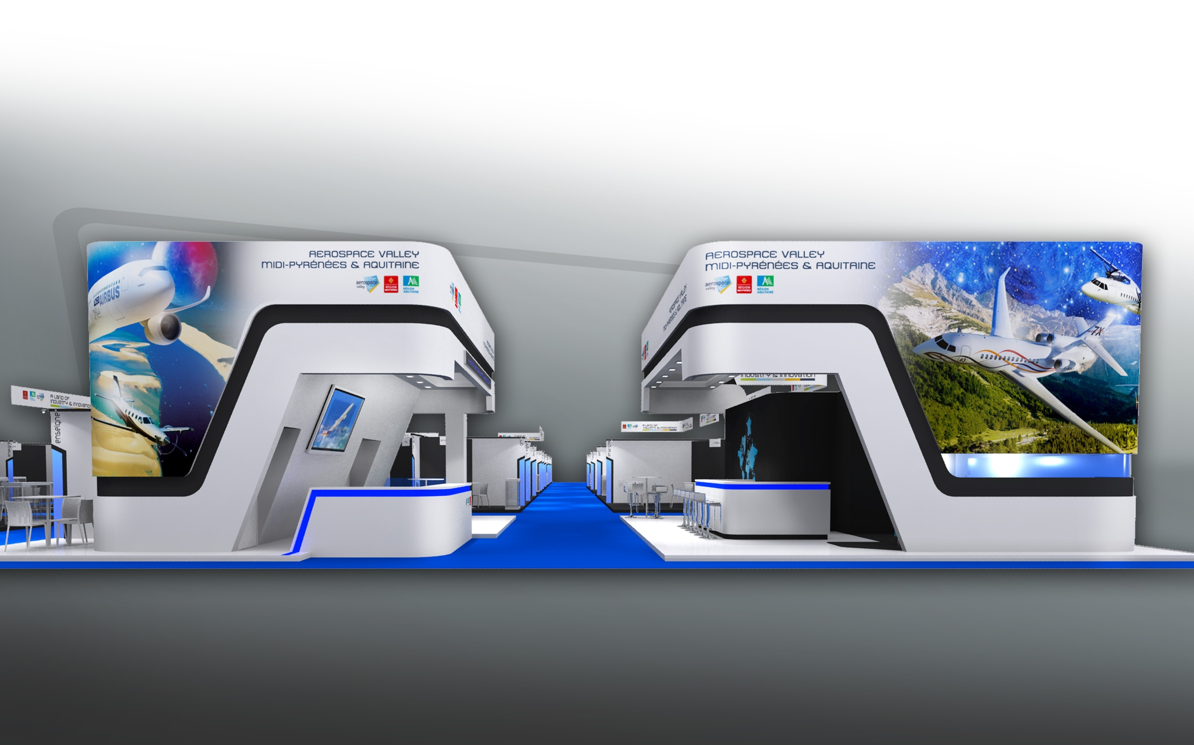 Légende :maquette du stand Aerospace Valley au salon du Bourget, imaginée par le standiste Idée Fixe (Nantes).