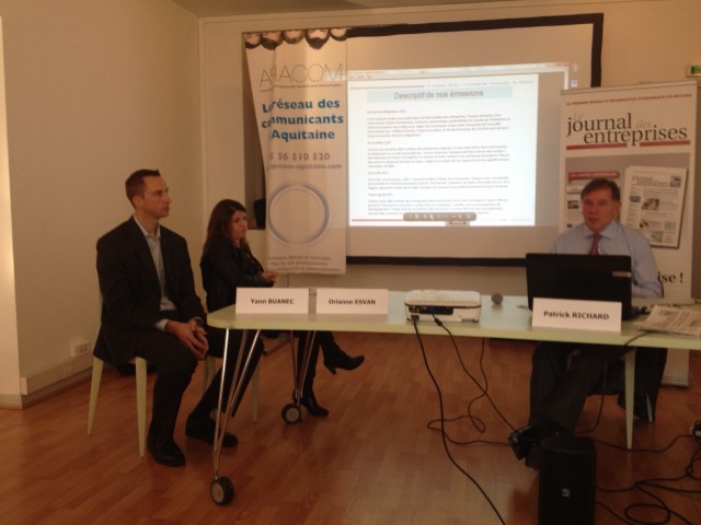 Les Matins de l’APACOM recevaient jeudi 13 mars l’équipe du Journal des Entreprises : Patrick Richard, fondateur et actionnaire majoritaire et l’équipe bordelaise, Orianne Esvan et Yann Buanec, chef d’édition.