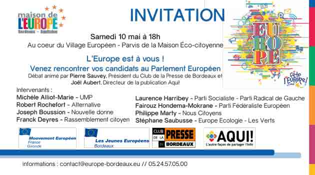 Samedi 10 mai à 18 h sur le Parvis de la Maison Ecocitoyenne de Bordeaux, au cœur du « Village Européen », Pierre Sauvey, président du Club de la Presse de Bordeaux, et Joël Aubert, directeur de la publication d’Aqui!, animeront un débat sur ce thème, avec les différents candidats au Parlement Européen.