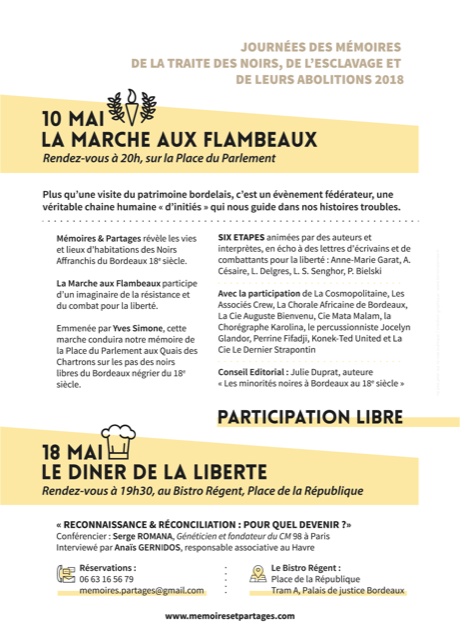 Pour Mémoires et Partages, les commémorations débuteront le 10 mai. Après avoir participé à la commémoration organisée par la ville, l’association entamera dès 20 h ses propres rappels de mémoire. Ceux-ci consisteront en une Marche aux Flambeaux qui partira de la Place du Parlement pour ce terminer Quai des Chartrons. Cette Marche sera rythmée par un certain nombre de stations sur des thèmes divers : « la capture« , « la cale du navire« , « la plantation« , « le marronage« , « métissages« , « affranchis« , « liberté« . Un parcours guidé sur les traces des esclaves affranchis de Bordeaux au 18ème siècle. Car il y en avait : patron de restaurant, propriétaire d’hôtel particulier pour les plus chanceux. « Des signes des contradictions de cette société coloniale« , comme l’a souligné Karfa Diallo. Des rappels historiques fondés sur la thèse de Julie Duprat : « Les minorités noires à Bordeaux au 18ème siècle » (soutenue devant l’Université de Toulouse) a précisé Patrick Serres.