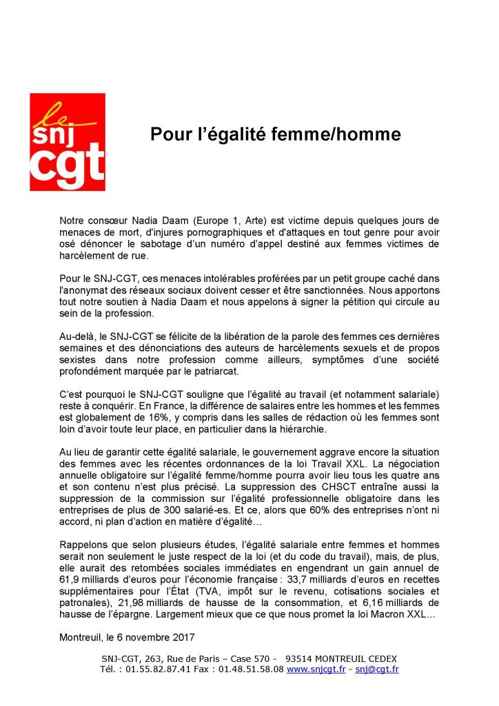 Au-delà, le SNJ-CGT se félicite de la libération de la parole des femmes ces dernières semaines et des dénonciations des auteurs de harcèlements sexuels et de propos sexistes dans notre profession comme ailleurs, symptômes d’une société profondément marquée par le patriarcat.