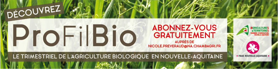 ProFilBio, trimestriel de l’agriculture biologique en Nouvelle-Aquitaine, est un magazine d’informations techniques créé conjointement par la Chambre régionale d’agriculture et la Fédération Régionale d’Agriculture Biologique de Nouvelle-Aquitaine.