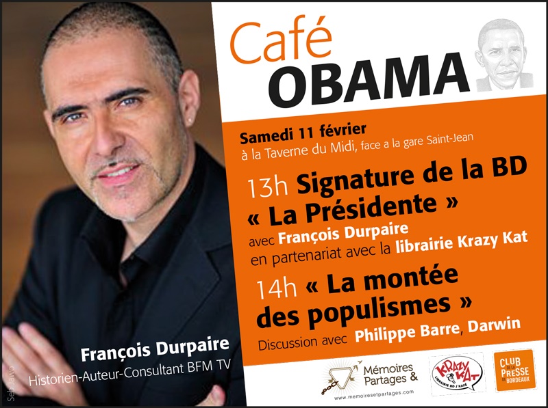 A la veille de l’élection présidentielle française, Mémoires & Partages, en partenariat avec le Club de la Presse de Bordeaux, invite François Durpaire pour le 3ème Café Obama sur le thème :
